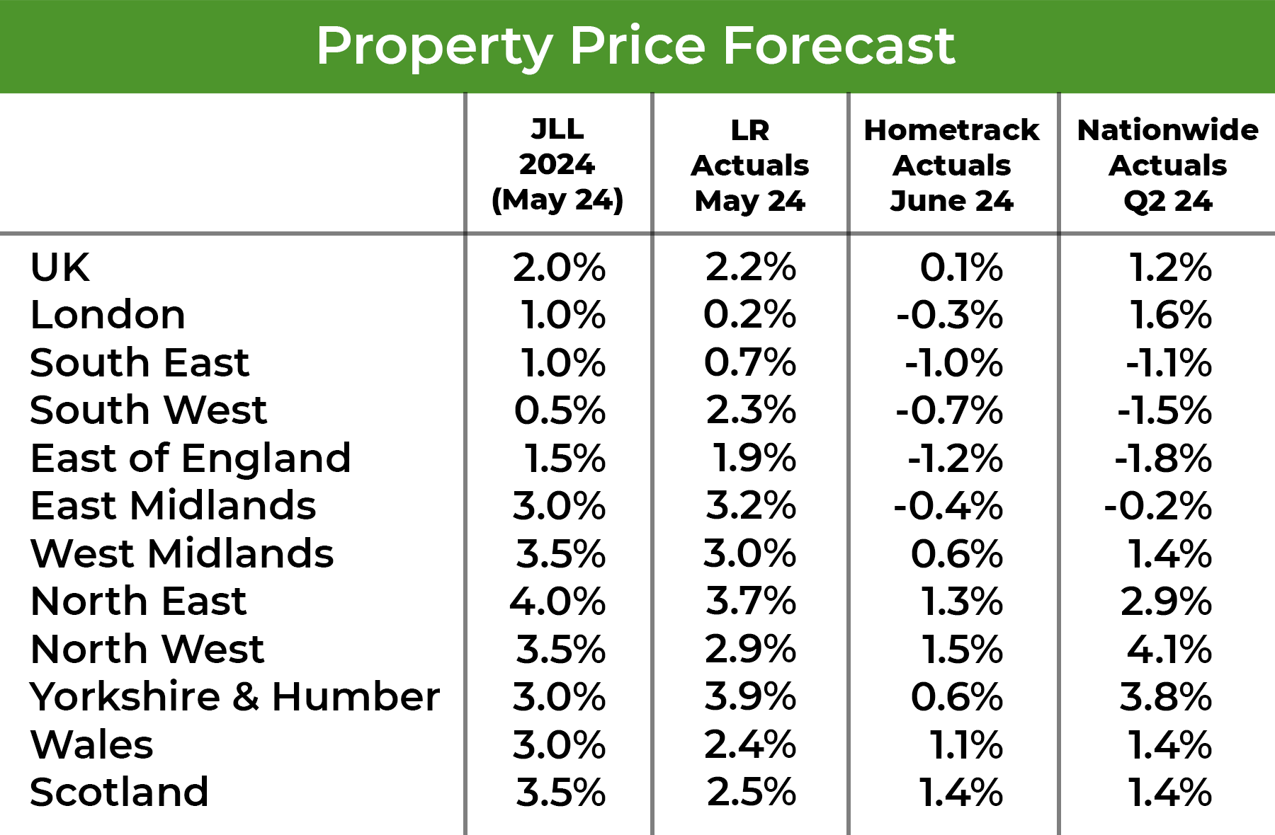 The above table shows a summary of JLL’s forecasts for 2024 and the actual figures reported by the Land Registry, Hometrack and Nationwide as at May/June.