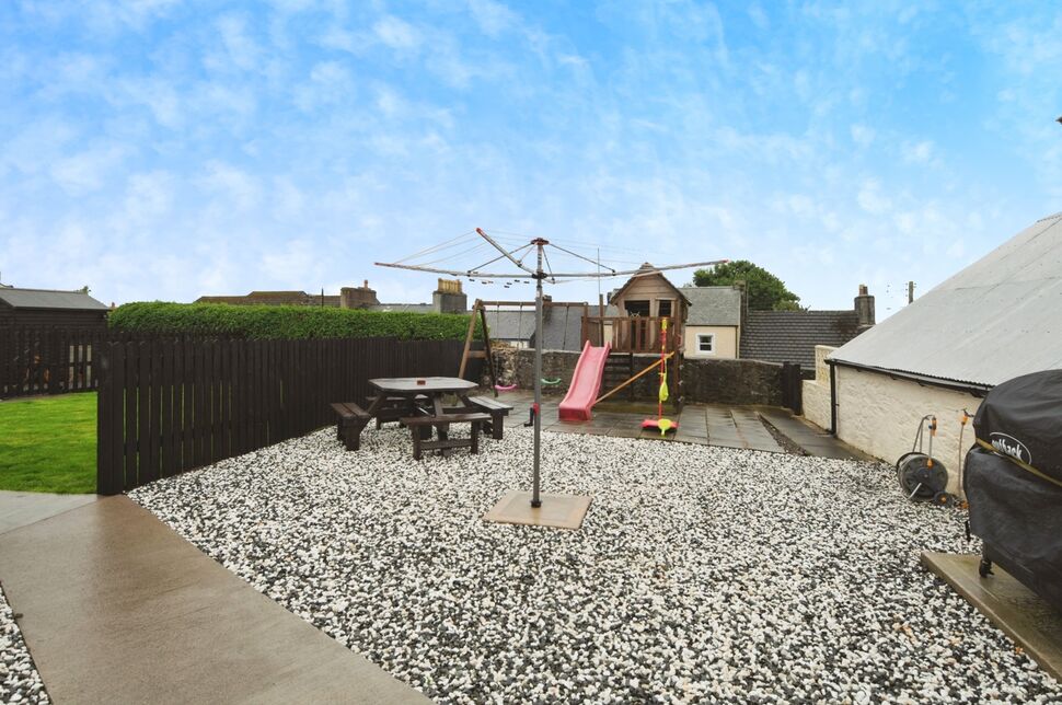 Externally, the property occupies a generous private plot with professionally landscaped gardens. These gardens are designed for ease of maintenance and feature ample parking and seating areas for outdoor enjoyment. An attached large workshop or store offers further convenience.