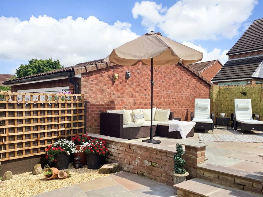 The rear garden has been landscaped by the current owners, creating three separate patio seating areas, with a raised lawn having planted boarders.
