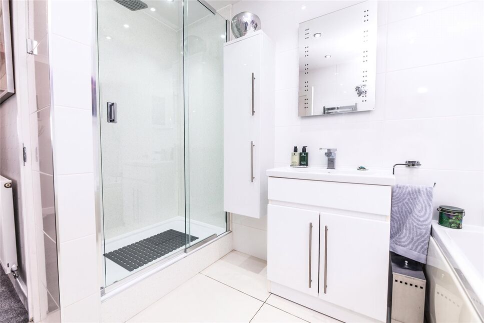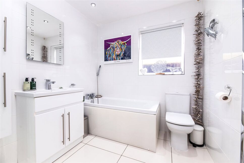 This generously proportioned and beautifully presented bathroom features a stylish four-piece suite, comprising a panelled bath with handheld shower attachment, a vanity hand wash basin, a low-level flush WC, and a separate double shower cubicle. Additional highlights include polished porcelain tiled flooring, recessed ceiling lighting, a chrome ladder-style heated towel rail, complementary wall tiling, and a double-glazed opaque window to the side elevation.