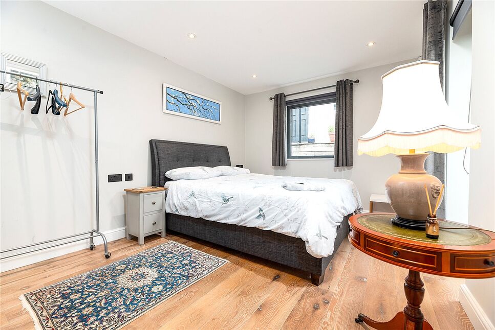 A rear facing double bedroom with window, wood effect floor covering and a television point.