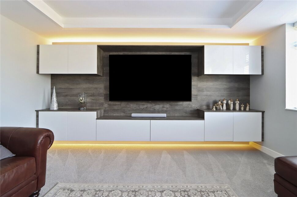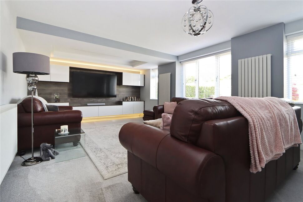 Upon entering, a welcoming porch provides practical space for coats and shoes, leading into a central hallway. The generously proportioned main sitting room, located at the front and extended to the side, is bright and inviting. It features a striking media wall with inset LED lighting and a contemporary feature light box, creating a perfect space for relaxation or entertaining.