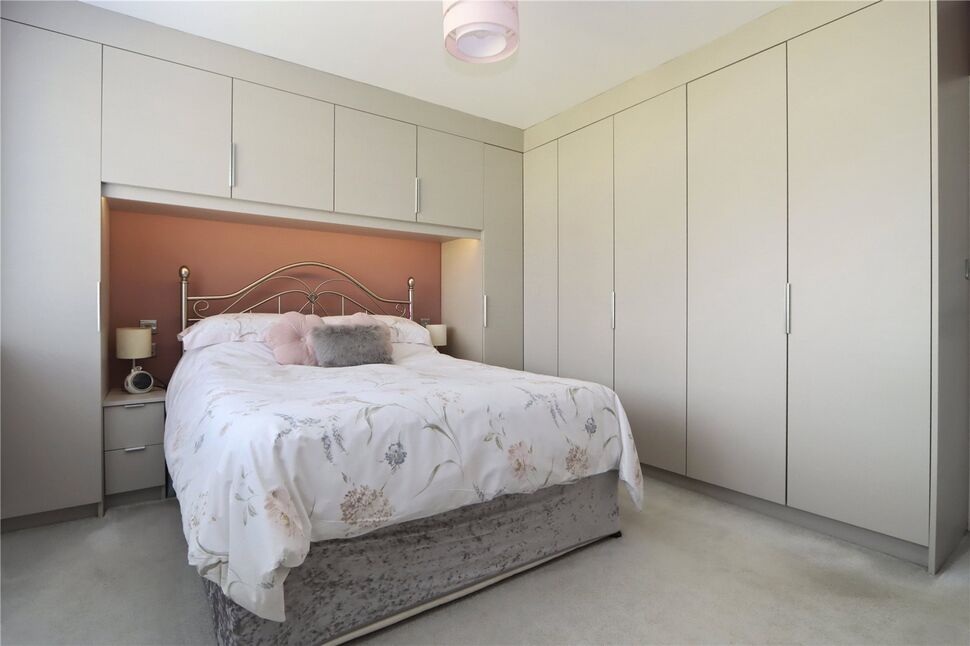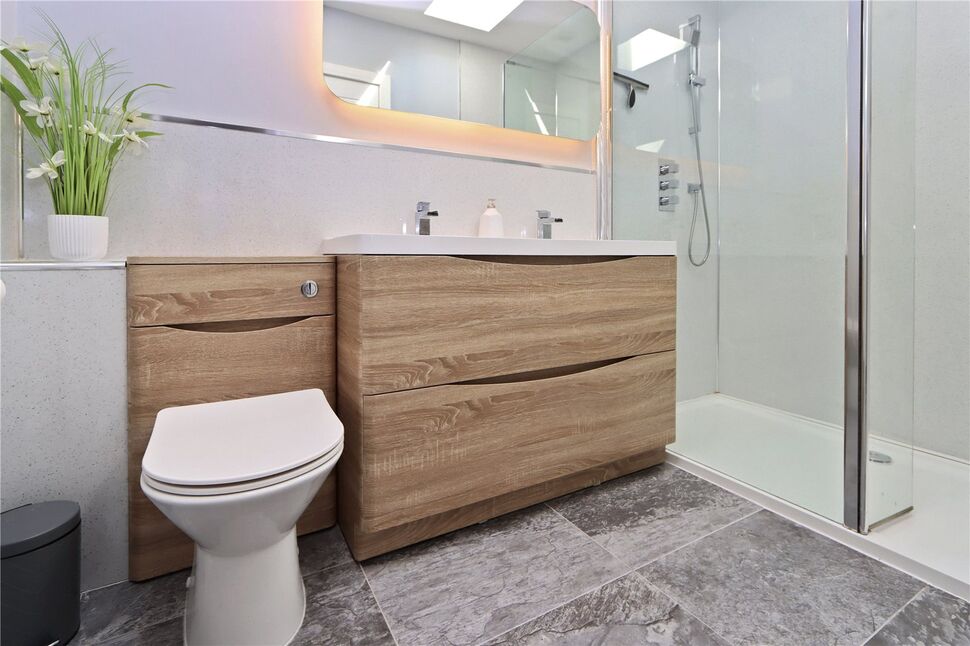The property also offers two spacious double bedrooms, each benefiting from generous built-in storage and ample space for additional furnishings. A recently installed contemporary shower room completes the interior, featuring a large walk-in shower, dual sinks, and a W.C.