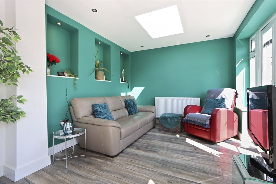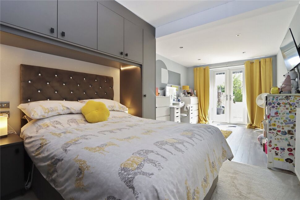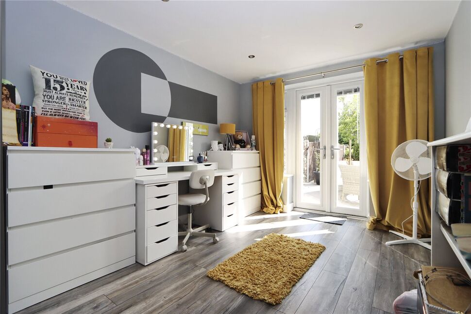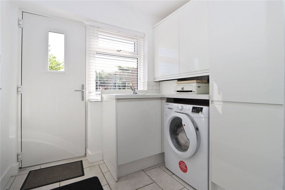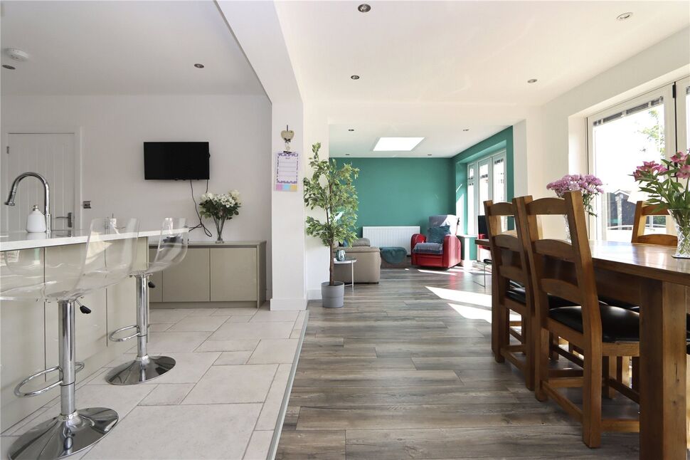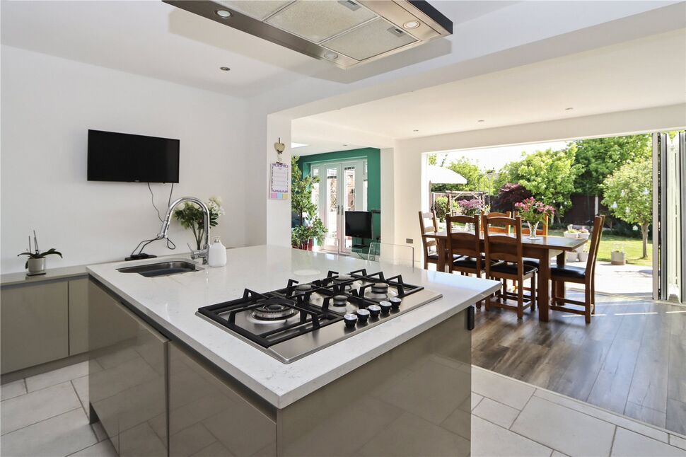 At the heart of the home lies the impressive open-plan kitchen, dining, and living area. Bi-fold doors seamlessly connect the space to the beautifully landscaped rear garden, flooding the interior with natural light. The modern kitchen is fitted with sleek high-gloss wall and base units, Quartz work surfaces, a range of integrated appliances, and a central island incorporating the sink and hob. The dining area comfortably accommodates a large table and includes a cosy snug-style seating area with French doors to the garden. Off the kitchen is a useful utility room with a W.C., and access to the third bedroom, currently used as a home office.