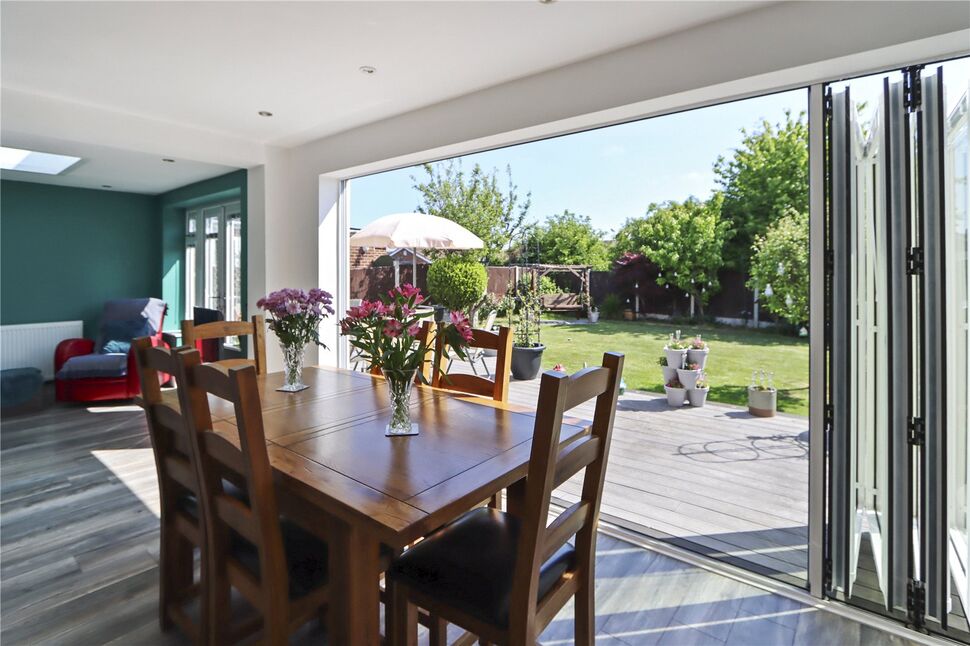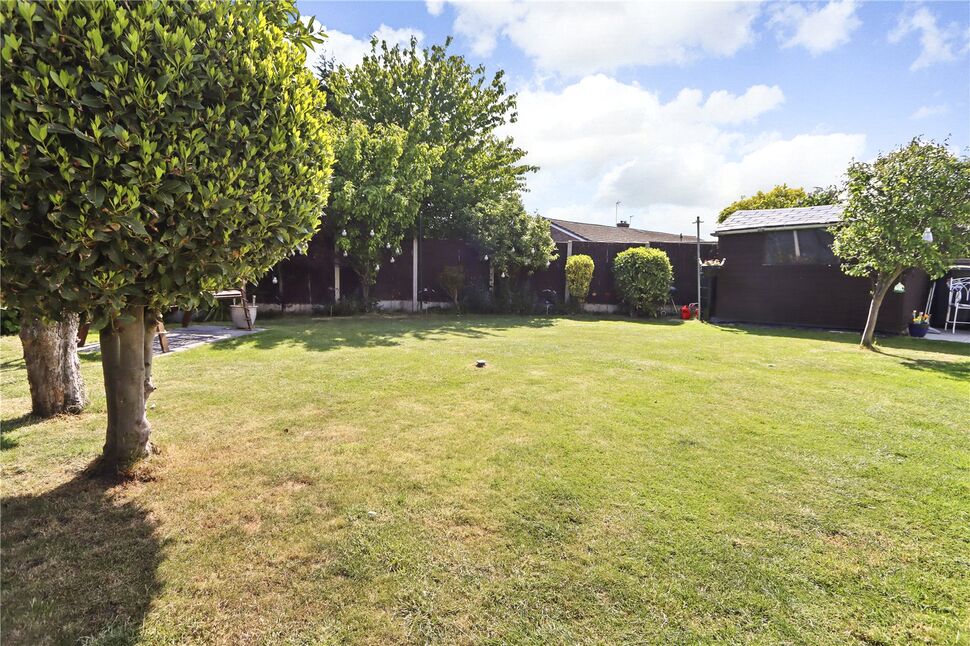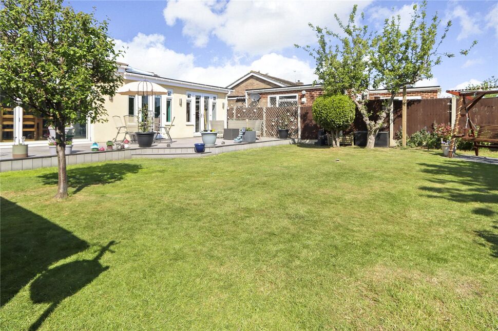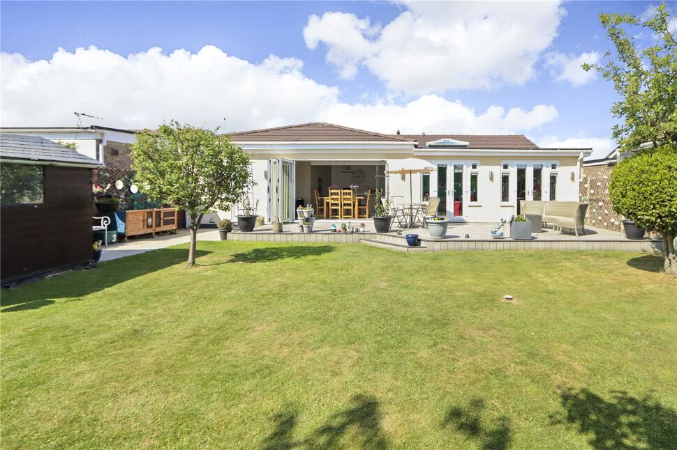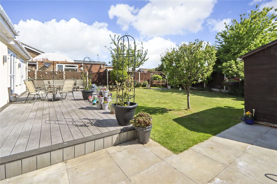 Externally, the home sits back from the road with a well-maintained front lawn and mature planted borders. A driveway provides off-street parking for multiple vehicles. To the rear, the level garden is beautifully landscaped with a variety of shrubs and plants, while a large decked area provides the perfect setting for outdoor dining and entertaining.