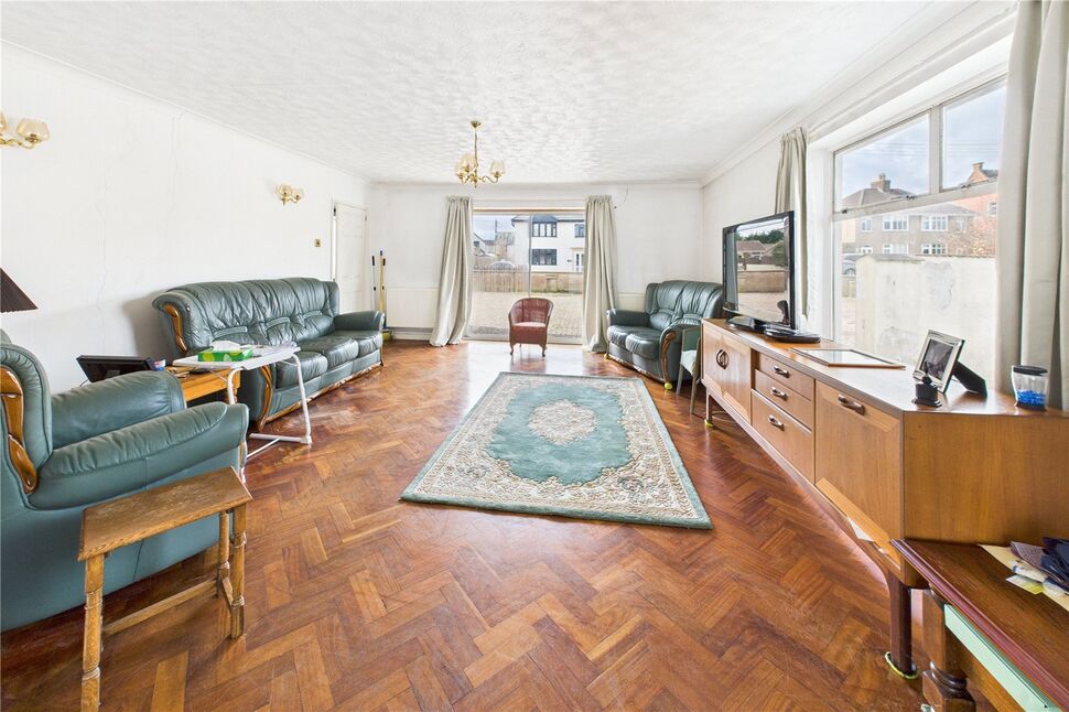 Double glazed patio doors to front, parquet flooring, two double radiators, single radiator, double glazed window to side, window to rear, door to rear.