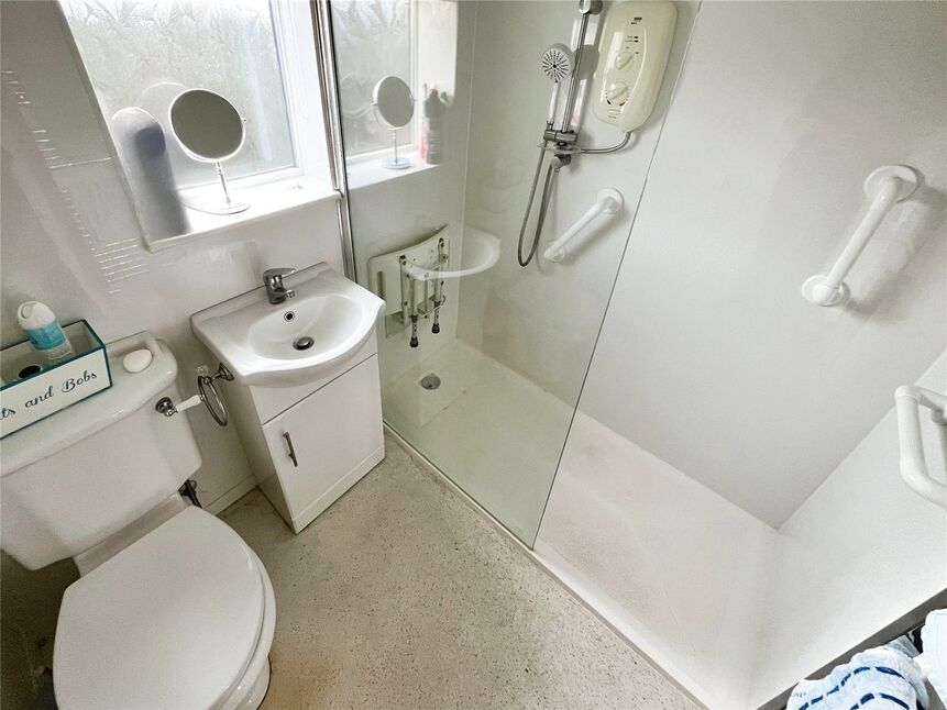 Fitted with a white refitted walk in wet room. The shower is equipped for disabled access with grip rails, seat and electric shower. There is a vanity wash hand basin with storage under and close coupled WC. The wall are tiled and the floor is low maintenance none slip. Double glazed window to side elevation.