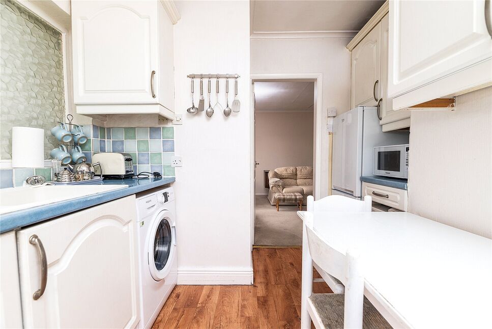 Having a range of fitted wall/base and drawer units with contrasting worksurfaces and inset sink/drainer. Other features include an integral hob/oven, plumbing for a washing machine, space for a fridge/freezer, tiled splashbacks, wood effect flooring, radiator, double glazed window to the side aspect and a double glazed side entrance door.