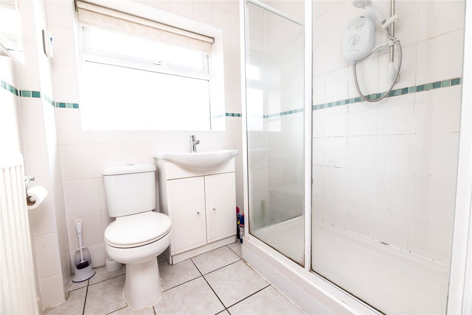 Having large glazed shower cubicle, vanity unit wash hand basin, low flush toilet, tiled flooring, tiled walls, in-built storage cupboard, radiator and a double glazed window to the front aspect.