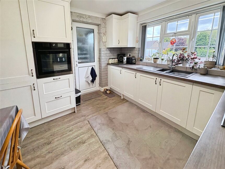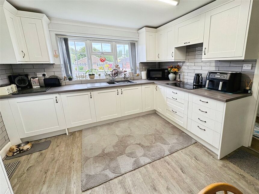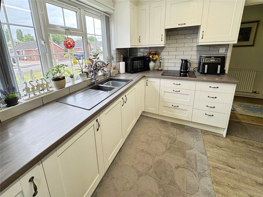 Being fitted with a range of eye level wall and base units with contrasting work surfaces fitted over, integral oven with 4 ring induction hob and extractor fan over, double glazed window to front aspect, one and a half bowl sink unit with drainer and mixer tap over, integrated washing machine, space for fridge freezer, radiator.