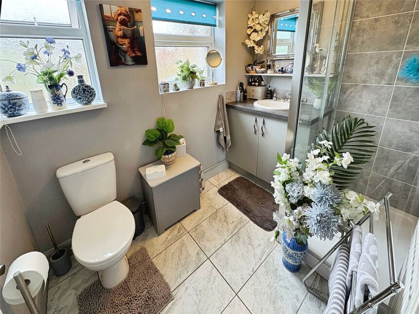 Comprising of shower cubicle with rainfall shower head fitted over, low level WC, vanity wash hand basin, two double glazed frosted windows to side aspect, radiator.