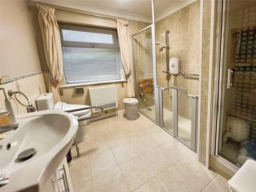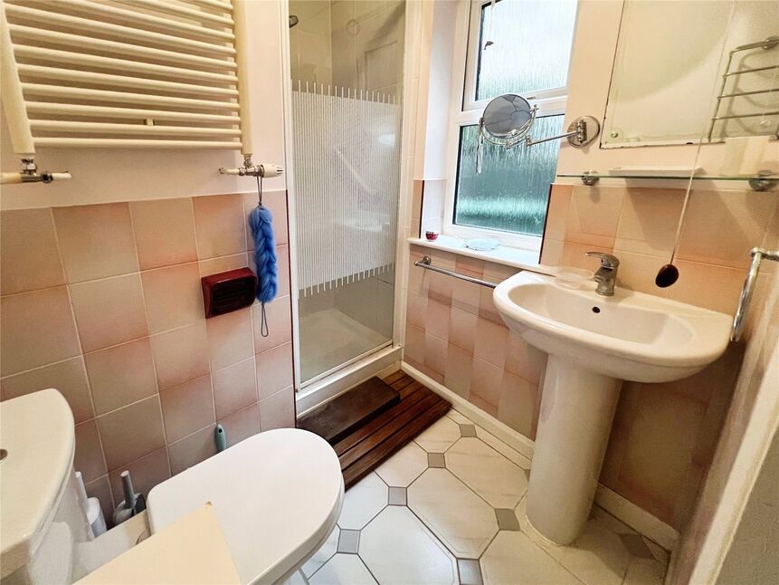 Comprising of shower cubicle, low level WC, pedestal wash hand basin, double glazed frosted window to side aspect, chrome heated towel rail.