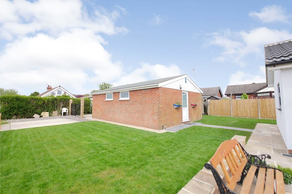 The front garden provides generous parking with a driveway extending to the garage. It also has a patio area, well-maintained lawn, an outdoor electric socket, and an exterior light. The rear garden is primarily laid to lawn. Additionally, this property includes a gated area of lawn situated opposite the front.