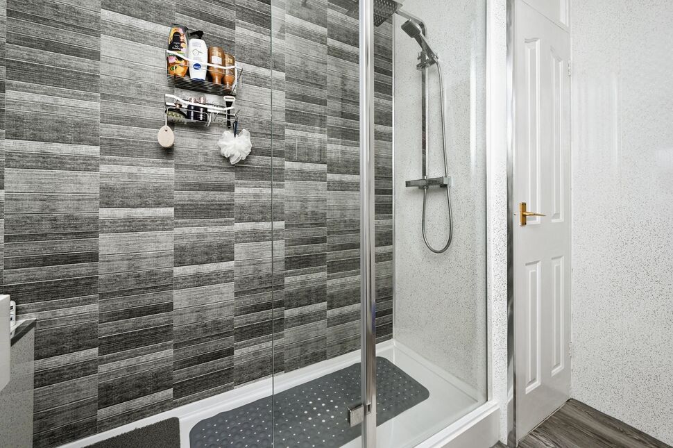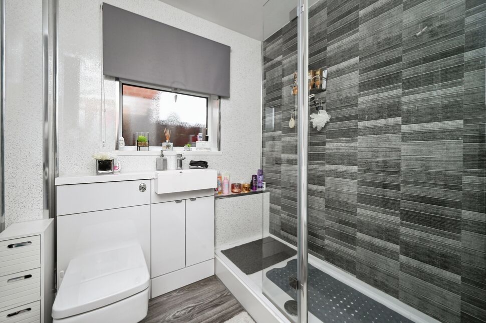 Fitted with a three piece suite including vanity unit with built in sink, plumbed shower with double walk in glass screen. Built in boiler cupboard , composite low maintenance cladded walls and heated towel rail. Double glazed window to side elevation.