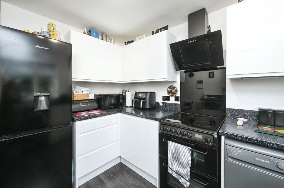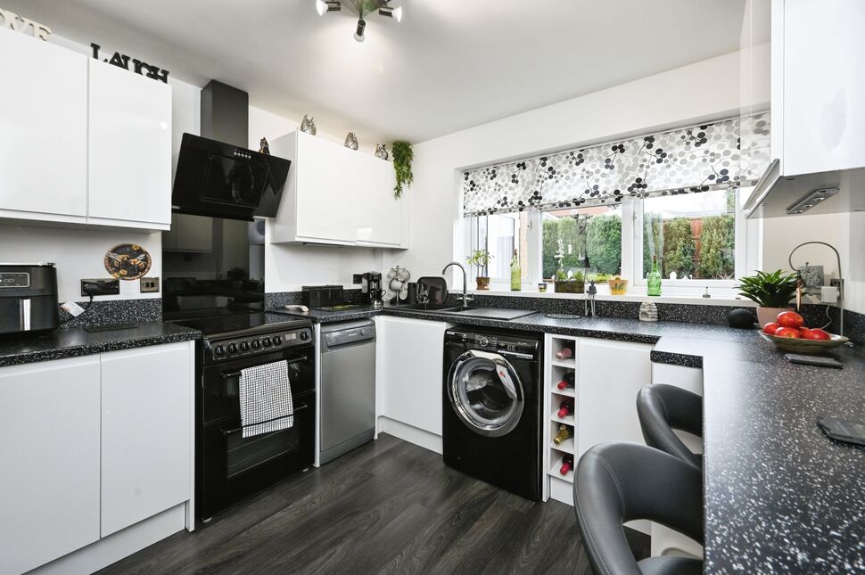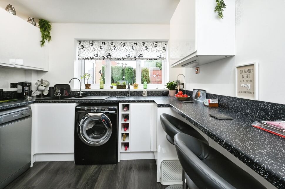 Recently fitted with a range of wall and base units Quooker tap with 1/2 drainer composite sink, built in oven with contemporary extractor hob over. Space for appliances and build in wine rack. Composite worktops and matching upstand incorporating a breakfast area.