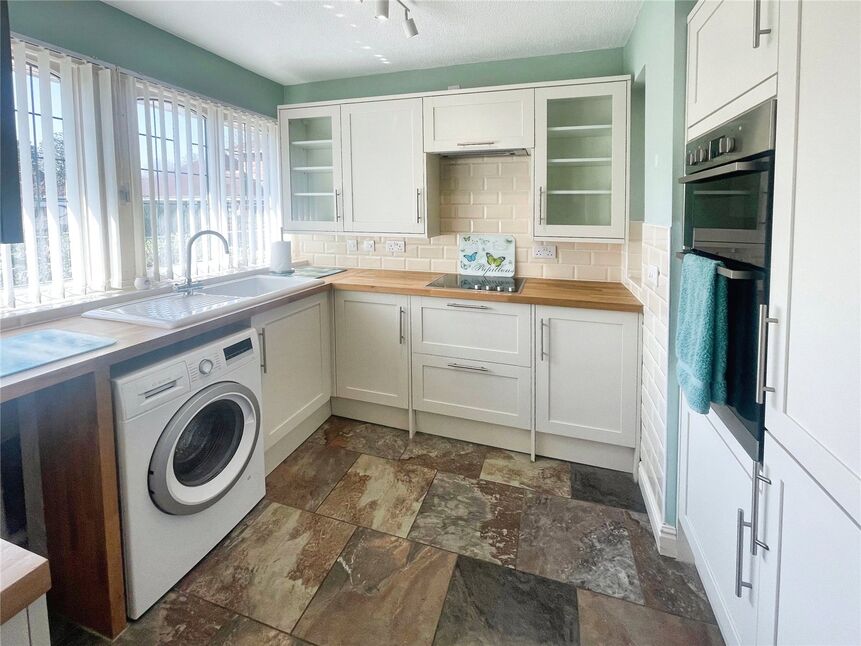 The double-glazed interior has been recently refitted with new electric radiators throughout, ensuring a cosy and warm environment. The reception hall includes cloaks for convenient storage. The kitchen is fitted with a matching suite of cream units and integrated appliances, providing a sleek and modern space for meal preparations.
