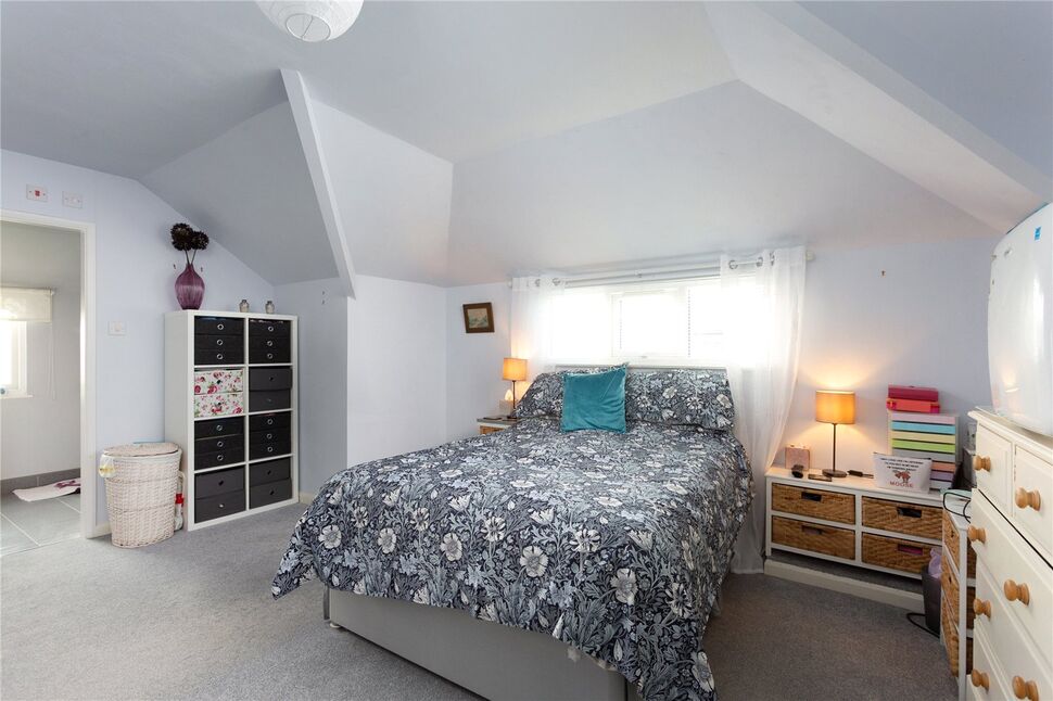 A staircase leads up to the principal bedroom in the roof space with extended dormers on three sides. This is a spacious room with lots of eaves storage and an ensuite shower room/WC.