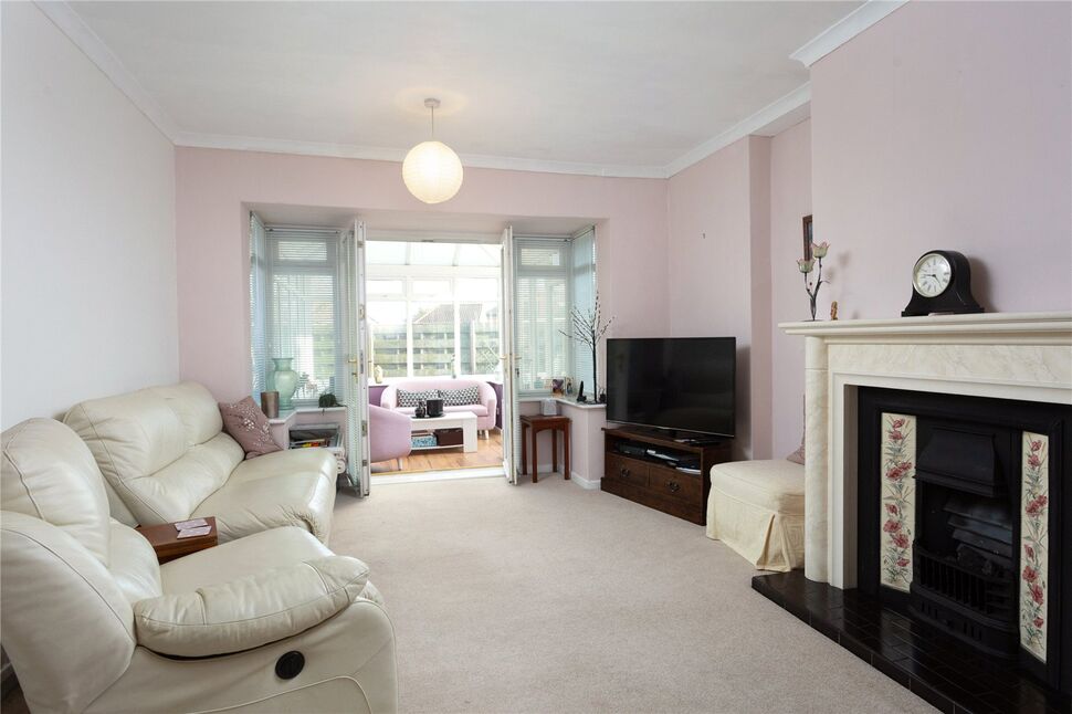 The central entrance hallway leads to the spacious lounge which has a feature fireplace with a gas fire, and French doors into the conservatory which overlooks and opens onto the rear garden. The kitchen/dining room has a tiled floor, a bay with French doors onto the garden, and is fitted with a range of wall and base units with stone effect worktops, tiled splashbacks, a range cooker, extractor hood, and spaces for a fridge/freezer, dishwasher and washing machine.