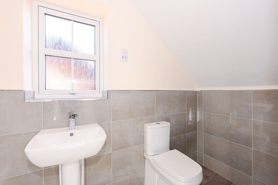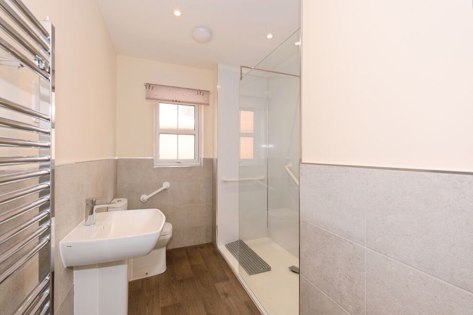 Located on the ground floor with white three piece suite, double shower, glass style screen, thermostatic shower and shower boards, sink, WC, heated towel rail and laminate flooring.