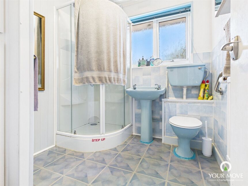 Double glazed obscured window to the side, shower cubicle, WC, pedestal wash basin, radiator, built in cupboard.