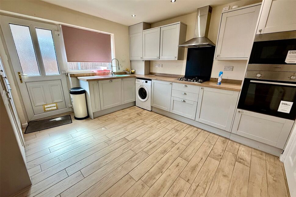 This stylish kitchen is fitted with a range of modern wall, base, and drawer units topped with complementary laminate countertops. Integrated appliances include a microwave, electric oven, four-ring gas hob with overhead extractor, and dishwasher. There is space and plumbing for both a washing machine and a fridge freezer. The room also features tiled flooring, recessed spotlights, a central heating radiator, a side-facing UPVC double glazed window, and a UPVC door providing access to the driveway. There is ample space for a dining table.