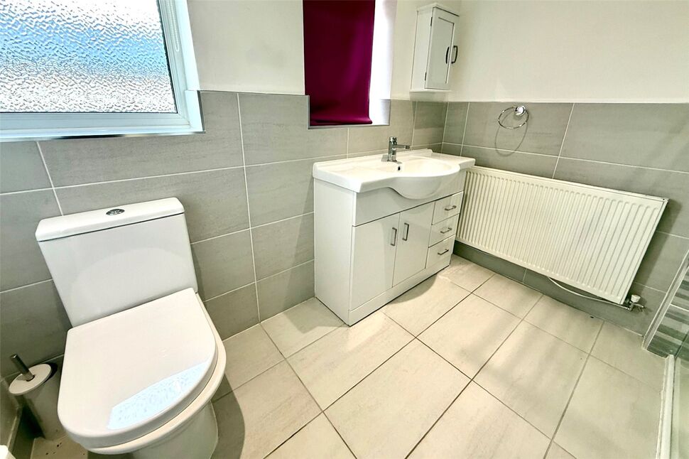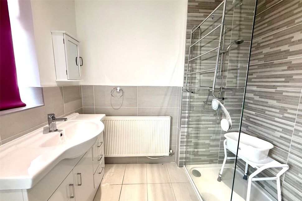 This modern and stylish shower room comprises of a low-level wc, vanity style hand wash basin with useful storage below and a double walk-in shower with mains fed thermostatic bar shower and glass enclosure. Further to this there is recessed spotlighting, a centrally heated radiator, two UPVC double glazed windows to the side elevation and tiling to both walls and floor.