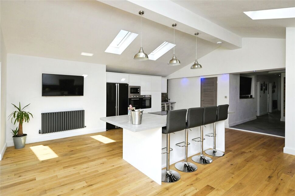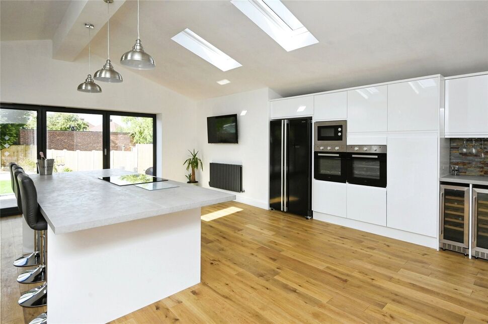 The heart of the home is the stunning kitchen extension, featuring a large island, modern appliances, utility room, and bi-folding doors leading to the garden. The kitchen is flooded with natural light from the Velux windows, creating a warm and inviting space.