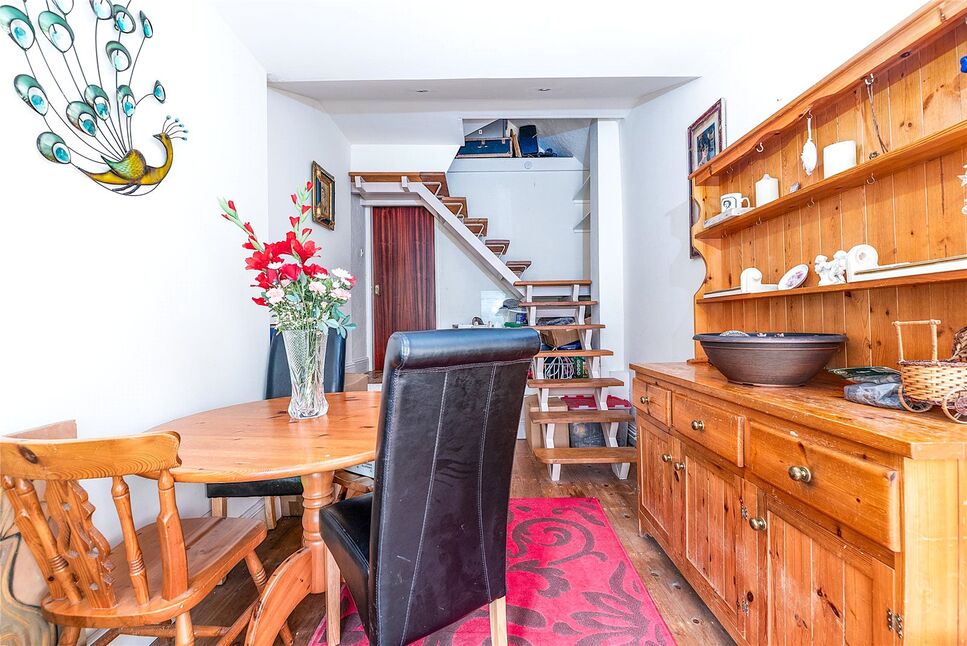 Separate dining room having wood effect flooring, a radiator and double glazed windows to the side and rear aspects.