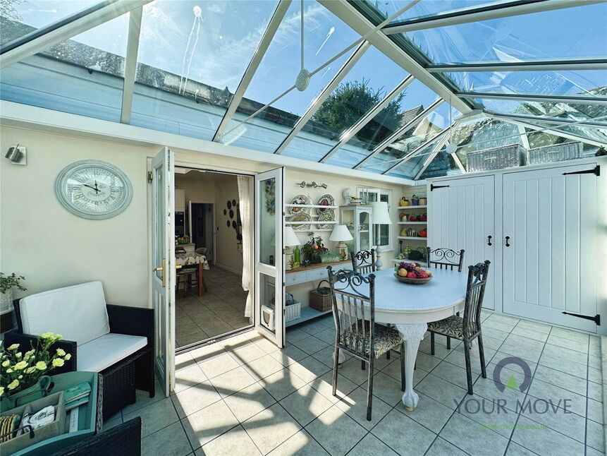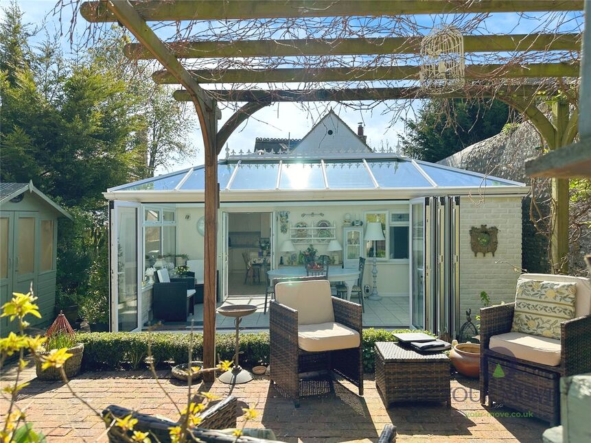 Upon entering, you are welcomed by a porch with a W/C, leading into the stylish living room with access into the modern fitted kitchen, complete with an island, integrated appliances, under cupboard lighting and a lintel in the ceiling for additional natural light. The front conservatory provides additional living space, while the rear conservatory, with underfloor heating and bi-folding doors, seamlessly connects to the landscaped garden.