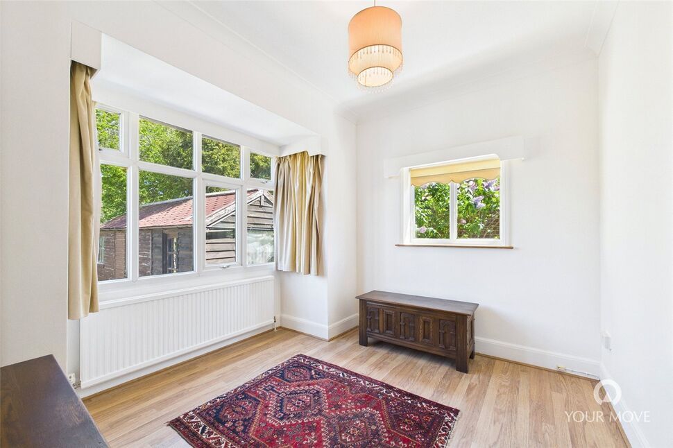 UPVC double glazed window to side aspect, UPVC double glazed walk in bay window to rear aspect, radiator, wood effect flooring, and coved ceiling.