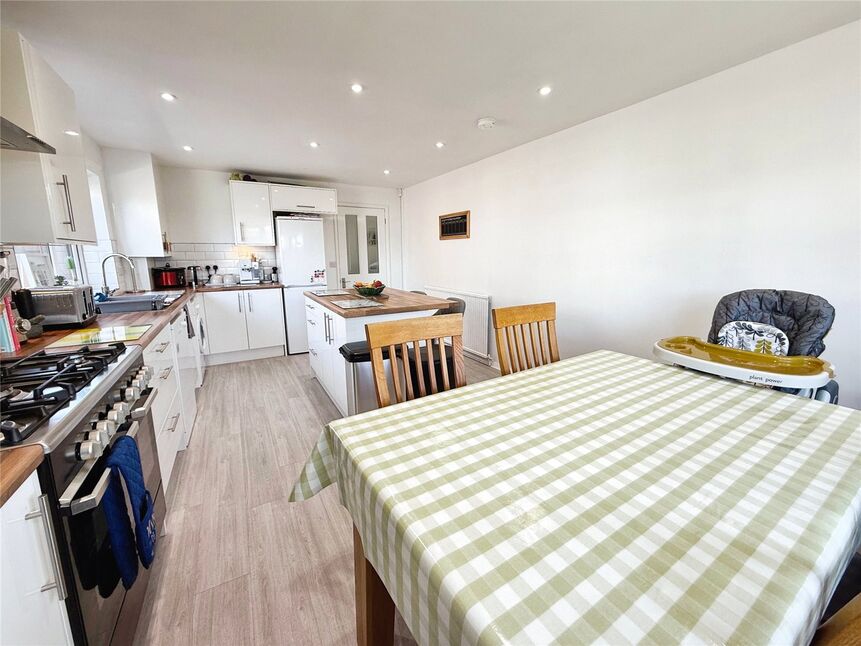 Modern and impeccably presented kitchen-diner comprising a range of wall and base units with contrasting roll edge work surfaces, breakfast bar island, sink and drainer, tile splashbacks, radiator, extractor hood, double glazed windows to the front and side aspects and laminate flooring. This spacious kitchen-diner also offers space and plumbing for a washing machine and dishwasher and space for a gas range cooker and fridge-freezer.
