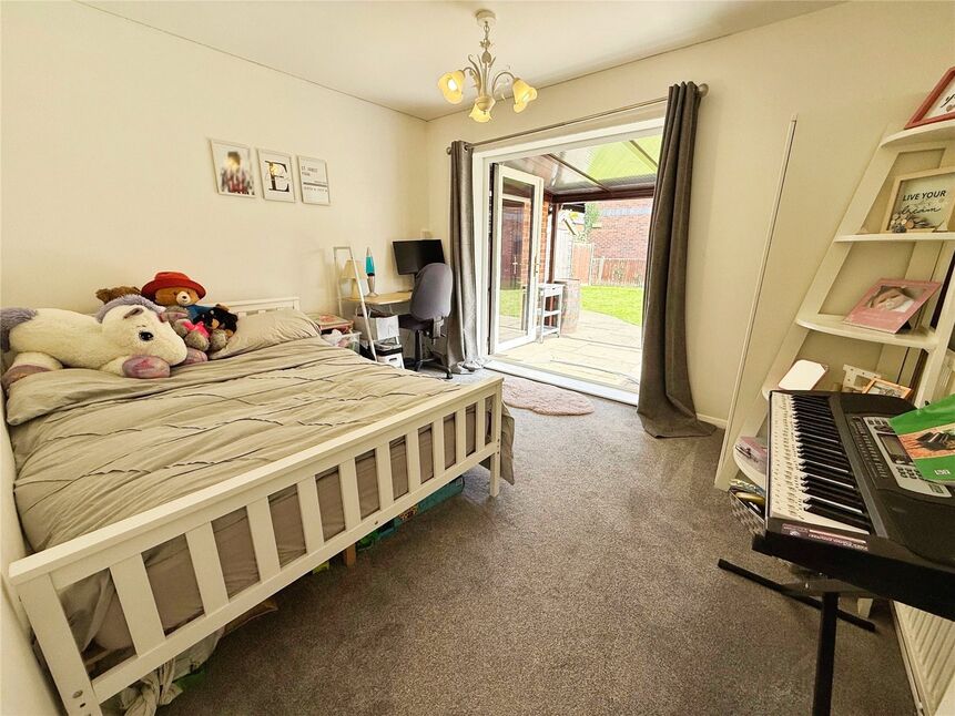 Double bedroom comprising carpet flooring, radiator and uPVC double glazed French doors to the rear aspect leading to the rear patio area.