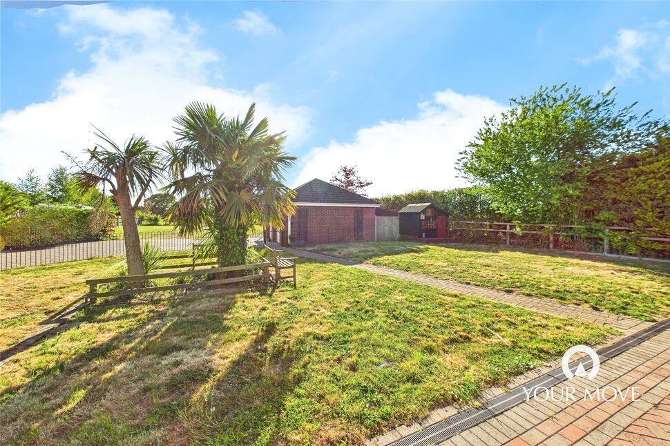 As well as a shingled, gated frontage you can enjoy secure gated entry into the rear of the plot, where a large brickweave driveway divides two garden areas – the traditional lawned garden behind the bungalow with a spacious patio to unwind, as well as an additional lawned field (which was acquired later) at the rear of the grounds.