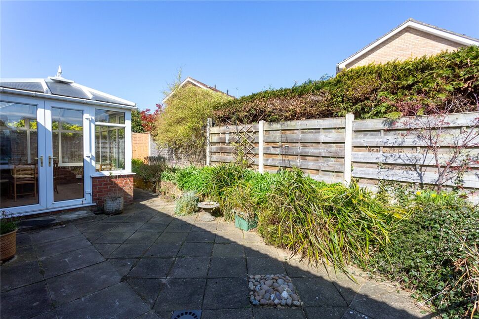 - Low-maintenance rear garden with raised seating area, greenhouse, and shed