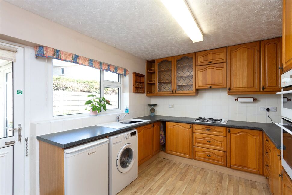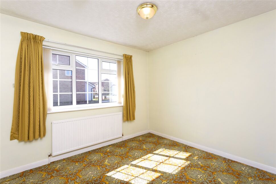 The covered entrance opens into a spacious hallway with a cloaks cupboard. The lounge/dining room is a comfortable dual aspect living space with two oriel bay windows overlooking the lawned front and side garden, and a fireplace with an electric fire. The kitchen overlooks the rear garden and is