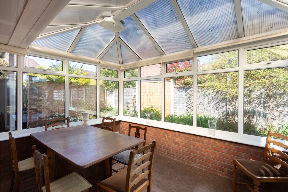 The kitchen door opens into the conservatory which has windows to three sides overlooking the garden with French doors out.