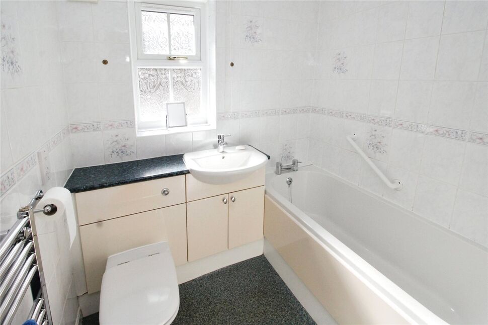 Having rear facing double glazed window, three piece white suite comprising of, panelled bath with shower & screen over, hand wash basin set in vanity unit and enclosed low level Wc. Tiling to walls and a heated towel rail.