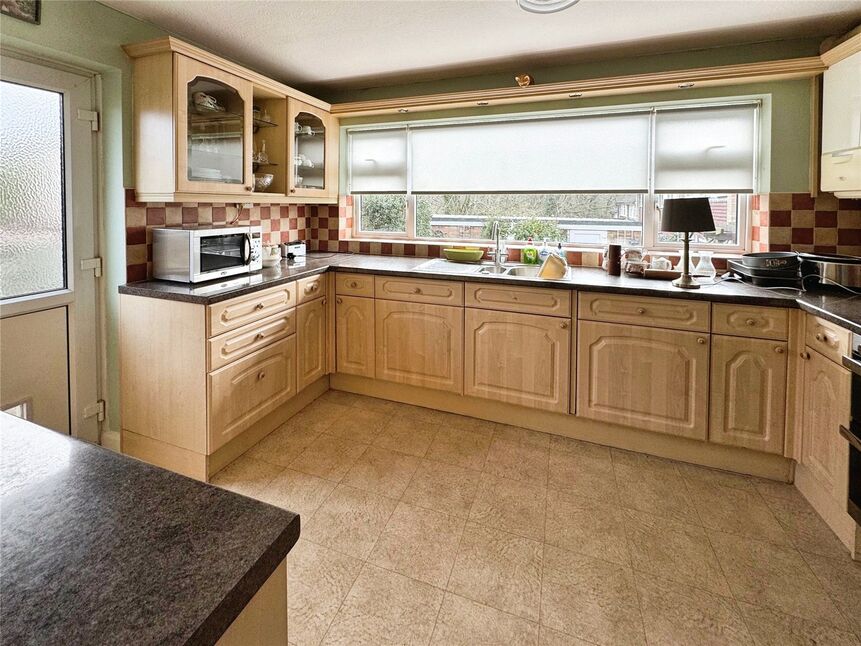 Laminate flooring. Part tiled walls. Wall mounted gas fired boiler. UPVC double glazed window to rear aspect and UPVC double glazed door to side aspect. The kitchen comprises a range of wall and base units with a rolled edge work surface over and a one and a half bowl stainless steel sink and drainer inset. Fitted double oven, gas hob, extractor hood, dish washer, washing machine, low level fridge and low level freezer. Space for further free standing appliance.