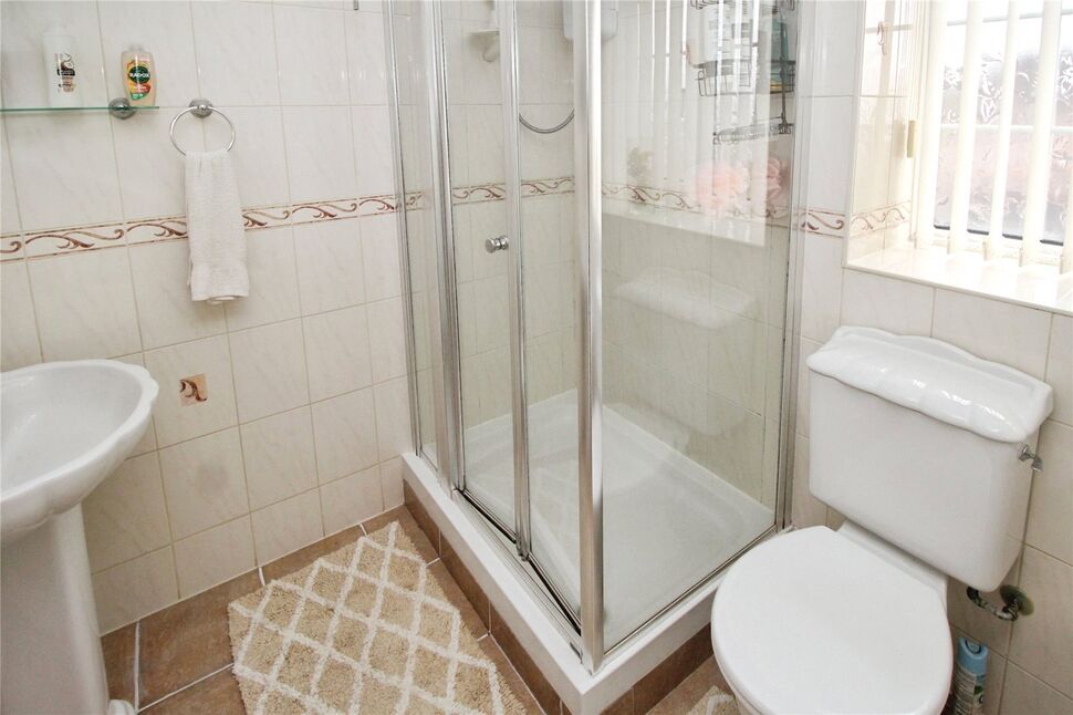 Having side facing double glazed window, three piece white suite comprising of, shower cubicle, pedestal hand wash basin and low level Wc. Tiling to walls & floor and a central heating radiator.