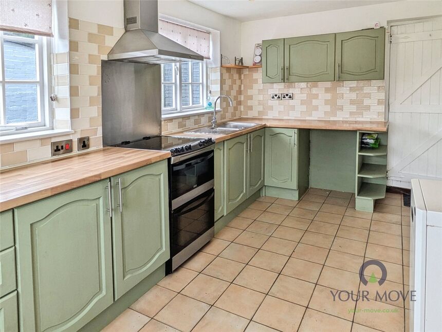Fitted in a range of base & wall units, comprising 1.5 bowl sink unit with mixer taps, built in cooker with double oven & hob, extractor over, plumbing for washing machine, oil fired boiler, tiled floor, windows to side & rear aspect.