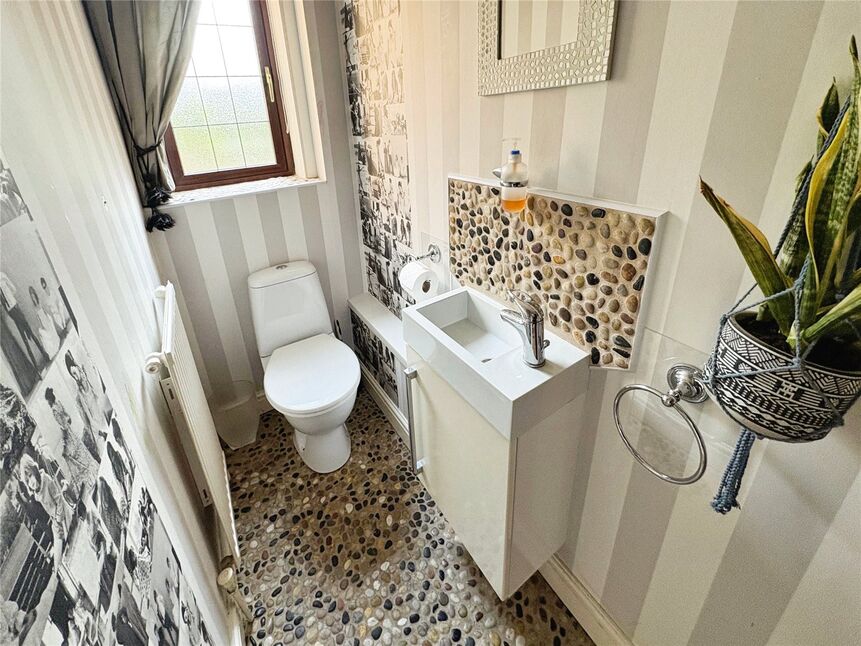 Having low level WC, vanity wash hand basin, double glazed frosted window to rear aspect, radiator, understairs cupboard off.