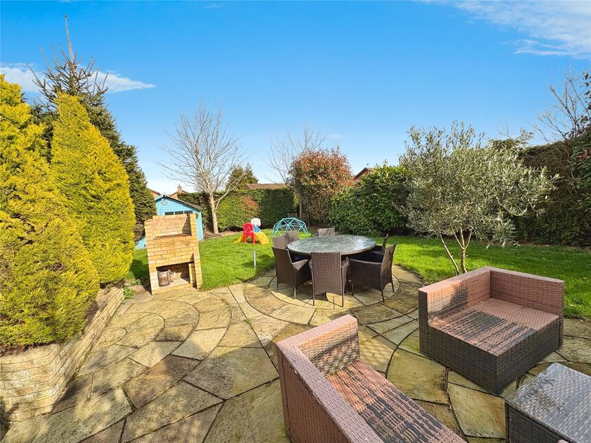 Large rear garden which is mainly laid to lawn with multiple patio areas, various mature plants and shrubs laid all of which is enclosed by fencing. There is also gated access down both sides of the property.