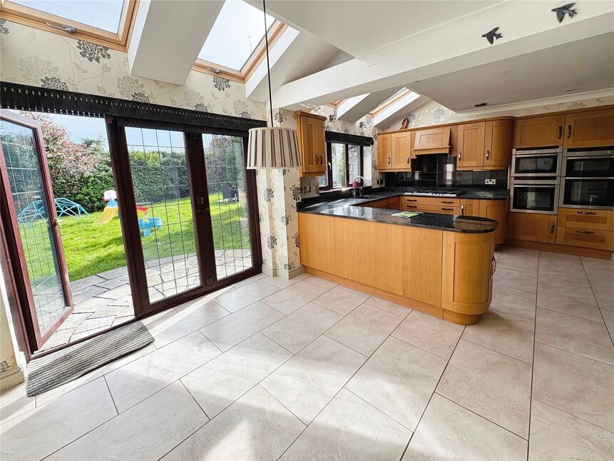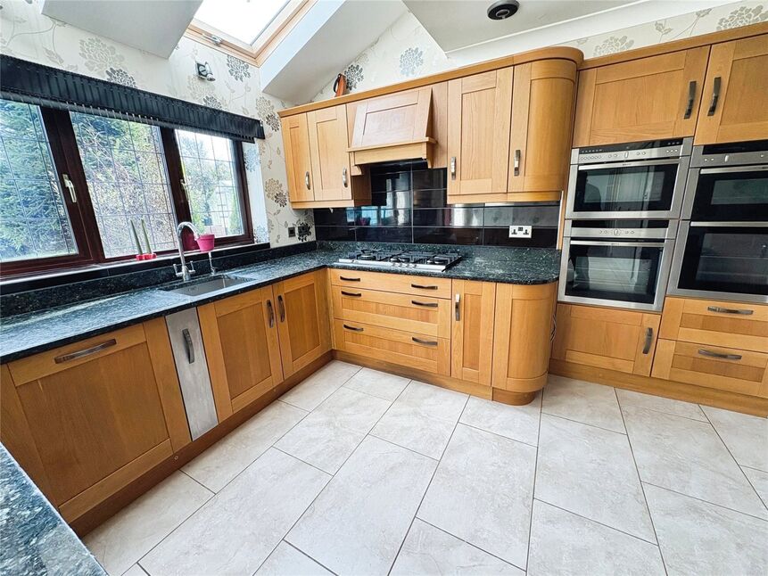Being fitted with a range of eye level wall and base units with contrasting granite work surface fitted over, integrated triple oven & microwave, 5 ring gas hob with extractor hood fitted over, integrated fridge & dishwasher, double glazed window to rear aspect, bi-fold doors to rear aspect, four Velux windows, storage cupboard off, under floor heating.