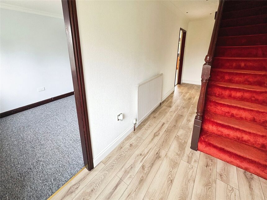 Front entrance door, stairs rising to first floor, radiator.