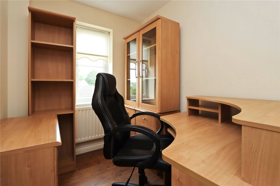 Stairs from the hall lead up to the first floor, where there are two double bedrooms, including the primary bedroom with a walk-through wardrobe to the en suite shower room. There is also a study/small single bedroom and stairs up the second floor, where there are two further double bedrooms, with dormers and Velux windows, and a family bathroom, which is fitted with a white suite.