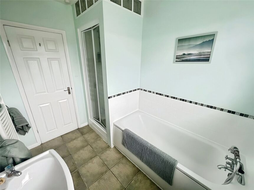 The great sized bathroom benefits from enclosed shower cubicle and panel bath, LLWC and pedestal basin. Tiled flooring, double glazed opaque window to side and hot towel rail.