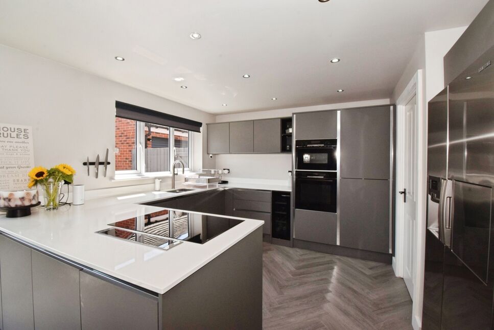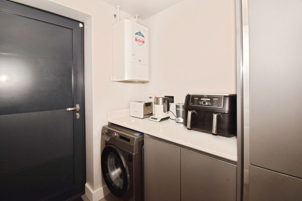 The kitchen is an epitome of modern living, fitted with high-end integrated appliances including a microwave oven, induction hob, extractor fan, electric oven, dishwasher and a wine cooler.