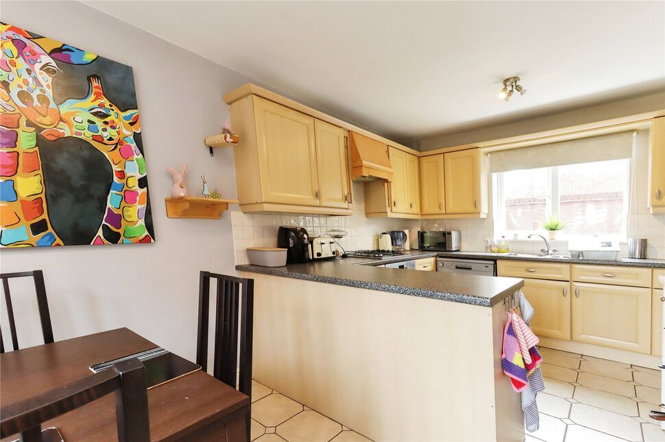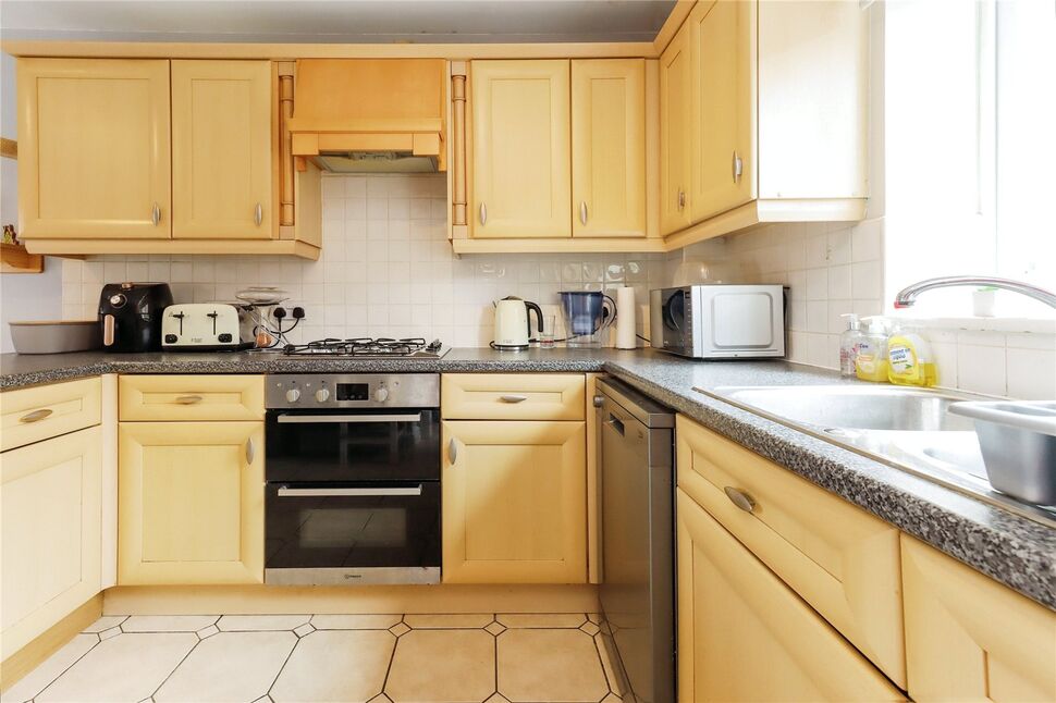 Range of wall and base units, space and plumbing for appliances, integrated gas hob, electric oven, extractor hood, sink, drainer, mixer tap, door into..