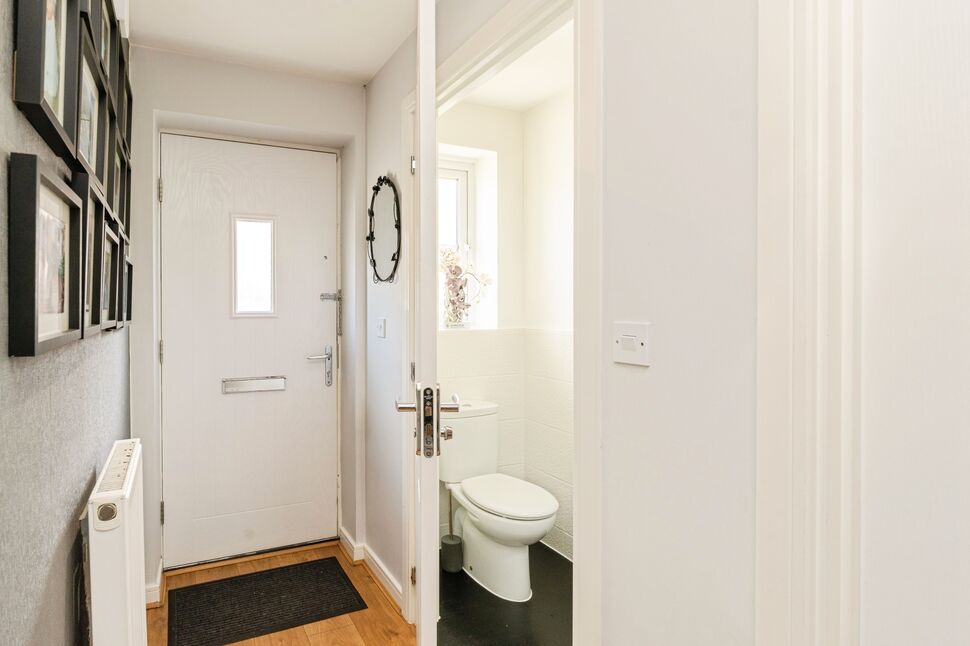A welcoming entrance hallway entered via a composite front door, wall mounted radiator and laminate flooring.