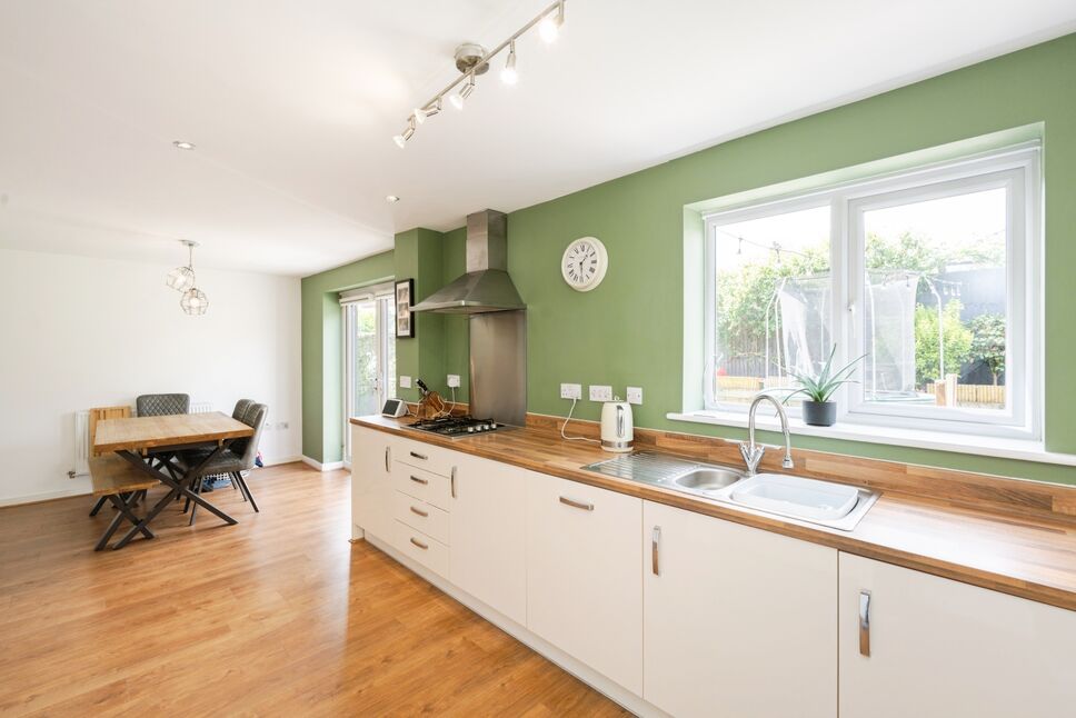 A bright and airy kitchen/dining area featuring complementary wall and base units with an integral stainless steel sink, fridge freezer and dishwasher. Oven and storage cupboard. Fitted with French doors to the rear garden and tiled flooring.